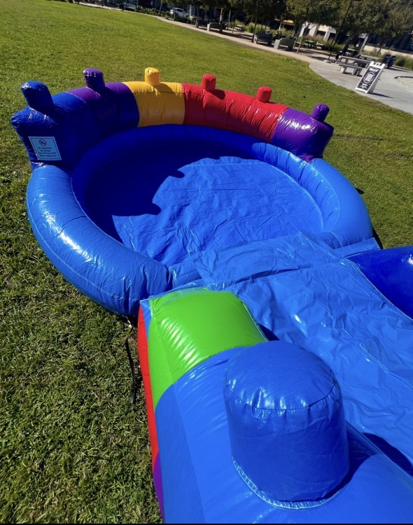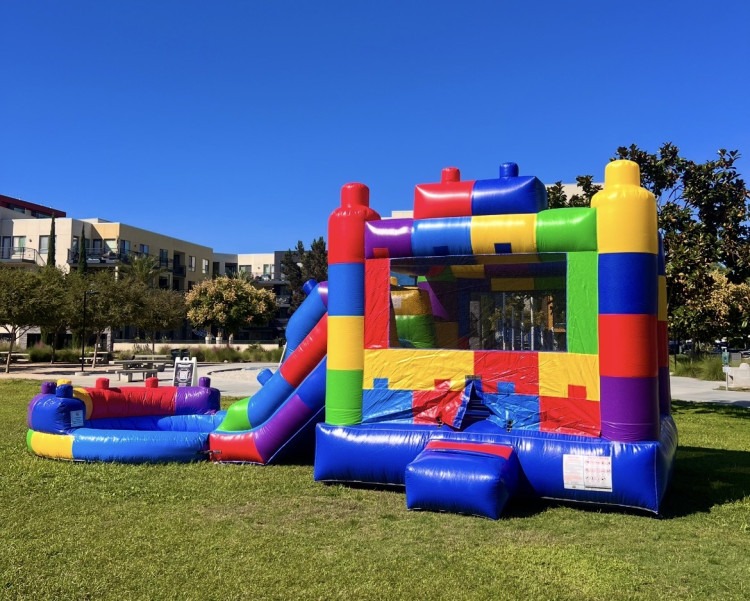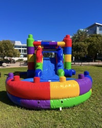 A vibrant, all-in-one Block Combo bounce house with water slide that turns any backyard or park into a mini amusement zone.  Kids can jump safely inside the roomy, mesh‑sided bounce area, take shots at the built‑in soft basketball hoop, then climb the easy steps and whoosh down the attached water slide into the shallow splash pool for a wet finish. Bright, block-patterned colors make it eye‑catching at parties, while the inflatable entrance step and mesh walls keep play contained and visible for supervising adults. Designed for classic combo fun, it’s perfect for birthday parties, school events, or summer playdates where energetic kids want bouncing, sliding, and splashdown excitement all in one rental.