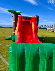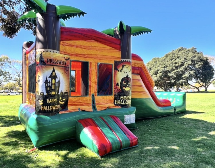 Bright, festive, and built for nonstop fun, this Palm Tree Halloween Combo brings a colorful bounce area and an attached dry slide together in one easy rental. The roomy bounce chamber is surrounded by mesh windows for adult visibility and airflow, and a low step entrance so kids can get in and out safely. Inside they’ll find a short climb with soft steps leading to the top of the slide, then a smooth, dry slide landing into an inflatable run-out—perfect for birthday parties, school events, or holiday gatherings. The exterior features palm tree columns and Halloween-themed panels for a seasonal look that’s playful rather than spooky.  It’s designed for active kids who want bouncing, climbing, and sliding in one compact unit.